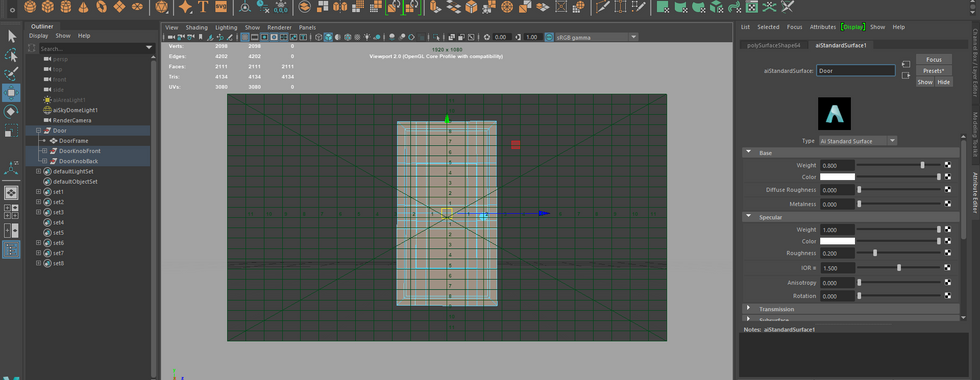 For this part, I assigned a new material in the shader via Arnold. aiStandardSurface. Then I used smoothness on the smoothed model on the door. I did some previews on the doorknobs for smooth although I didn't like that there too many edges and faces for the doorknobs so I left them untouched. Afterwards, I did an FBX export of the geometry by doing 'file > export selection > FBX.'