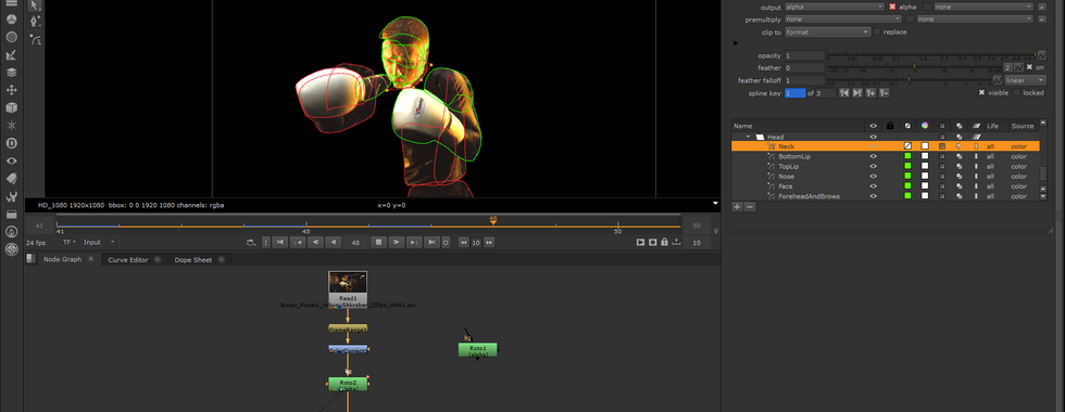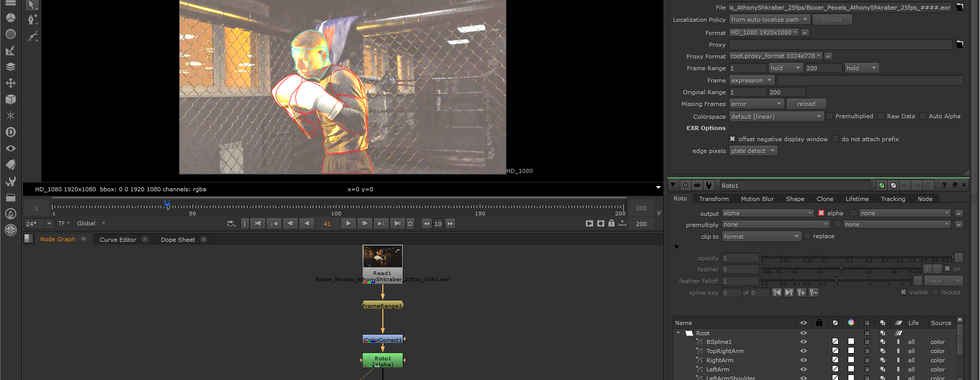I opened up NukeX and from there I read the exr files for the boxing video. Afterwards, I added in a 'framerange' node. The frame range is 41-50. I also added nodes such as 'roto' 'colour correct 'premult'. In the 'roto' node I produced BSplines to create the bone structure and proportions of the body itself. Speaking of the BSplines I grouped up the folders themselves into respective body parts.